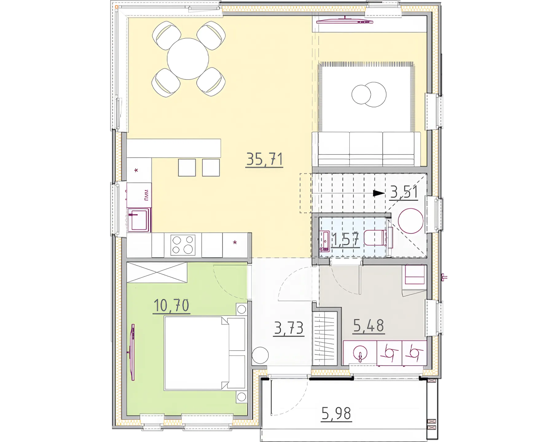 Structo on projekteeritud kuldlõike põhimõttel. Kõrged laed (3.2m) ja panoraamaknad loovad piiritu ruumi tunde 120m² pinnal.